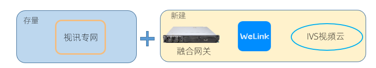 場景五:用戶現(xiàn)網(wǎng)已建IVS視頻云,新增建設(shè)華為視訊專網(wǎng)、WeLink和融合網(wǎng)關(guān),實現(xiàn)云上云下協(xié)同。